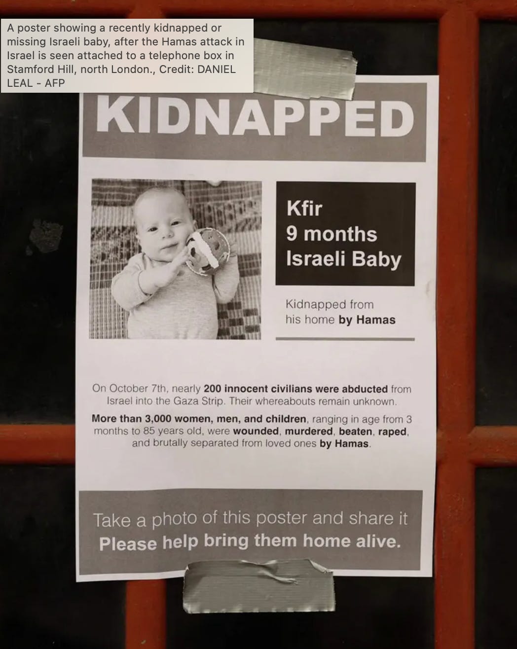 After yesterday’s delicious propofol nap (colonoscopy: one polyp, sent for testing, not worried) I waded back into the social media waters to express my sadness about posters of Israeli victims from the Hamas massacre being ripped down. It seemed to me that tearing down images of kidnapped civilians is cruel, and I compared it to the posters that sprouted up in the days following 9/11. What would the reaction have been like if groups of people had wandered the city tearing down the posters of the lost and missing following that attack? It seemed like a reasonable analogy to me, but I was quickly disabused of the notion.