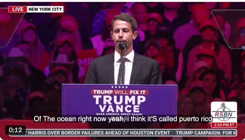 There’s a political rally currently underway at New York’s Madison Square Garden featuring a line-up of MAGA acolytes, grifters, wannabes, and the comedian Tony Hinchcliffe. If you didn’t catch any of Tony’s remarks, here’s a sample: