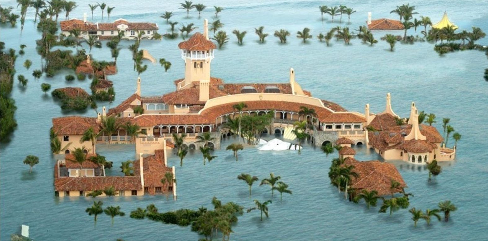 Now let’s talk about Florida, home state of our current Commander-in-Chief. Mar-A-Lago is located at 1100 South Ocean Blvd., just down the road from Jeffrey Epstein’s former estate, in the tony enclave of Palm Beach. On October 27th of this year, Palm Beach set a record for highest-recorded 24-hour rainfall, prompting the city to issue a rare warning of “considerable” flash flooding. Such warnings have become more common in recent decades owing to manmade climate change, which our president pretends he does not believe in. He’s lying.