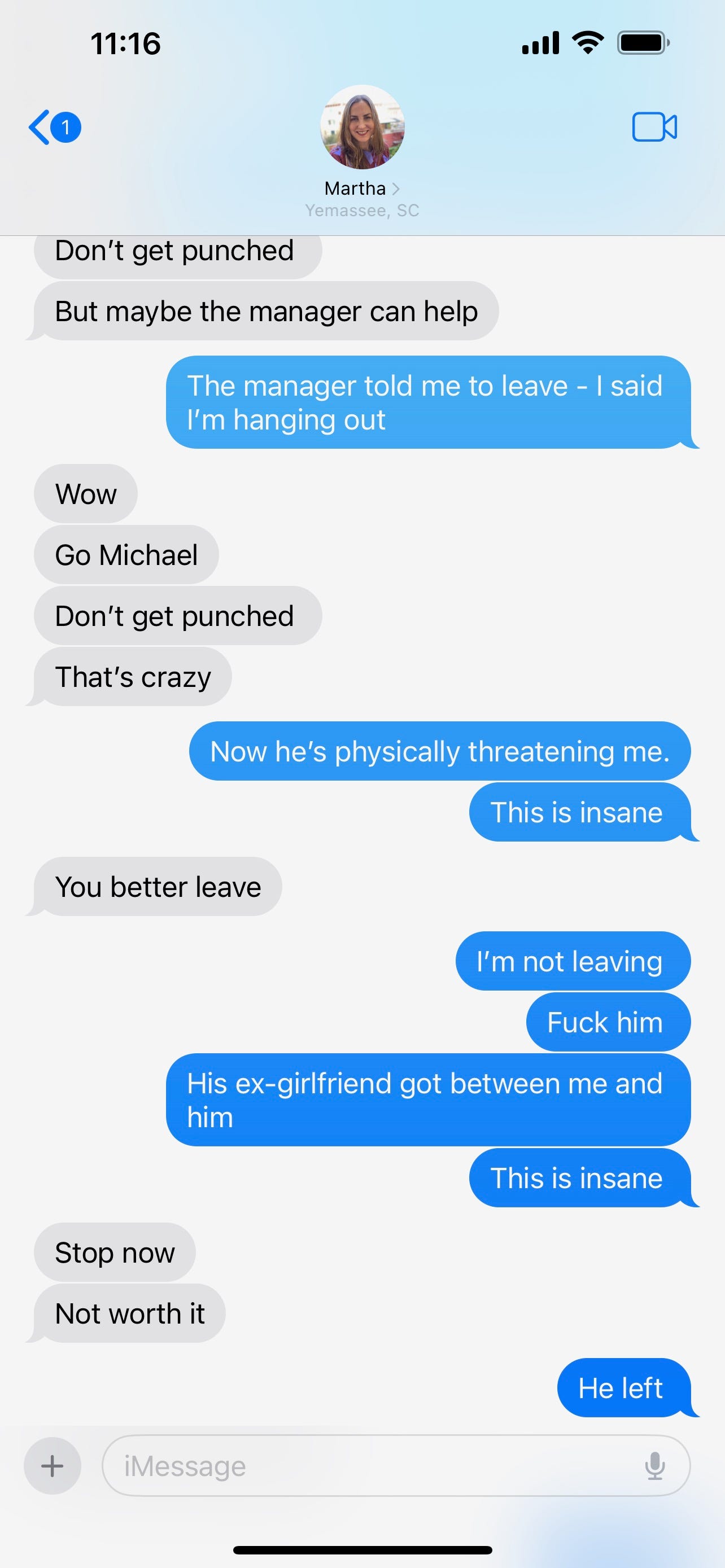 His ex-girlfriend now puts her body between ours, arms outstretched as if she’s holding him back. He has not left the couch. It’s clear this is not the first time she’s done this on his behalf. She tells me I should just go. I tell her no, I’m going to stay. She leaves to get the manager. I sit back down and text my wife again.