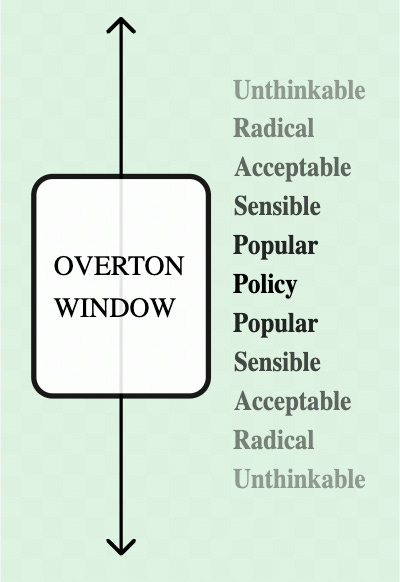 I’d like to speak for a moment about windows, specifically of the Overton variety. A refresher for those, like me, who sometimes mix up their Overtons with their Dunning-Krugers, the Overton window refers to a range of political opinions arrayed along a vertical axis, as pictured below: