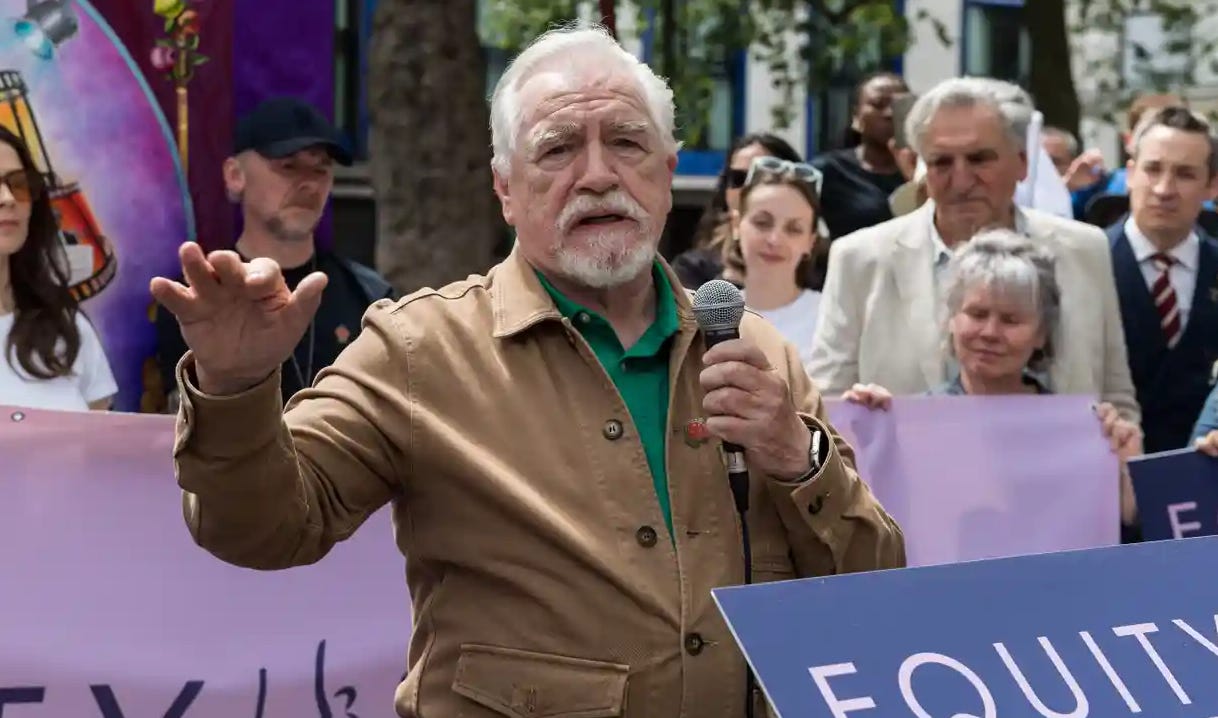 This afternoon in London, I went to a rally hosted by Equity UK, the British actors’ union, in support of their American sister union, SAG-AFTRA. There were lots of famous faces there, including Brian Cox, Simon Pegg, Hayley Atwell, and my friend Rob Delaney, who served as emcee. (Actually, I’m not sure Rob and I are “friends” so much as professional acquaintances, but in show business that counts as friends, perhaps even family.) There were loads of other British actors there I didn’t recognize, but my wife did because she pretty much only watches British television so, for her, it was a little bit like suddenly waking up inside of the BBC. The rally was upbeat, positive, and best of all, brief. An hour of clapping and people saying “solidarity” and then off to a good Indian lunch. All of this to say, I feel like I did my part for the day, which was not very much at all.